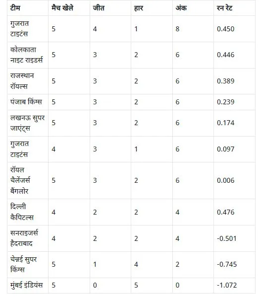अब गुजरात की टीम के 5 मैचों में से 4 जीत के साथ कुल 8 अंक हो गए हैं, जबकि दूसरे से छठे स्थान पर रहने वाली टीमों के खाते में 6-6 अंक हैं। अन्य टीमों की बात करें तो चौथी जीत के साथ ही गुजरात की टीम अंक तालिका में पहले पायदान पर आ चुकी है। कोलकाता नाइट राइडर्स दूसरे स्थान पर है। राजस्थान रॉयल्स सीजन की दूसरी हार के साथ तीसरे स्थान पर खिसक चुकी है। पंजाब चौथे, लखनऊ पांचवें और बैंगलोर छठे स्थान पर हैं। दो टीमों के पास चार और चेन्नई के पास दो अंक हैं। मुंबई का खाता अब तक नहीं खुला है।